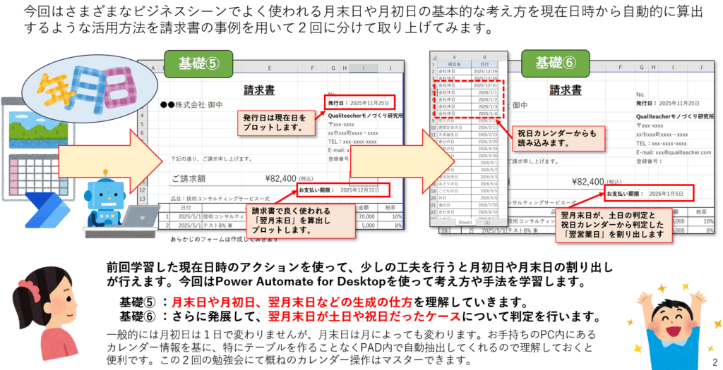 ここでは、前回の請求書フォーマットにつなげるようなしくみを構築していきますが、現在日から始めると検証が困難であるため、ユーザー側で好きな日を入力できるような形にして基本エンジンとして作成していき、最後に前回の基礎⑤のフローにつなげるような考え方で進めて行きます。