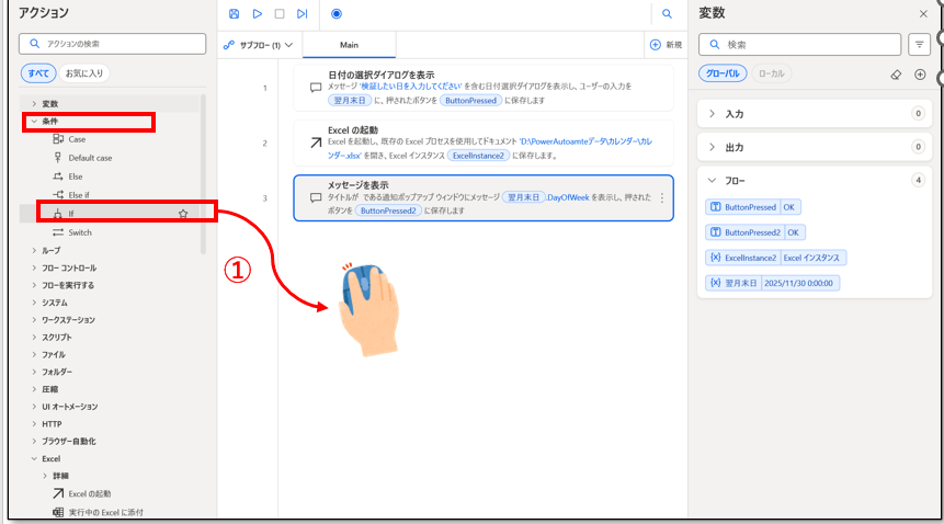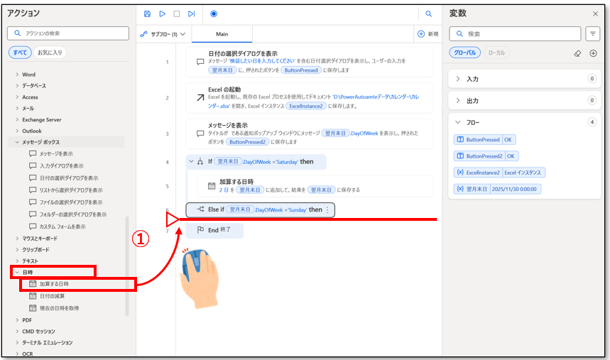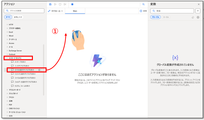 ① アクションのメッセージボックスを開き、「日付の選択ダイアログを表示」をドラッグ&ドロップします。