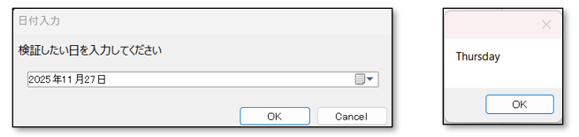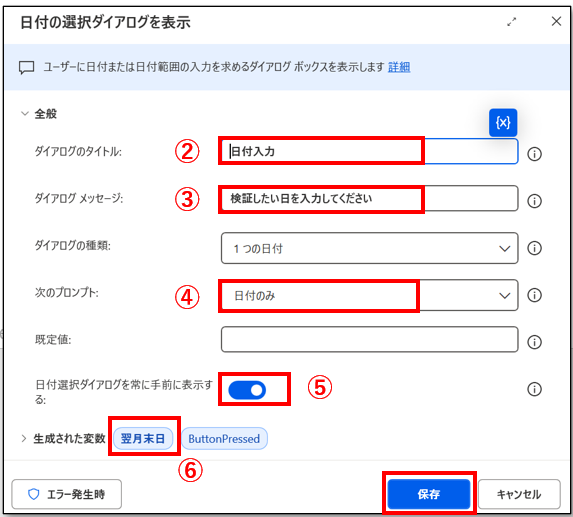 ③ ダイアログメッセージは、「検証したい日を入力してください」とします。こちらも任意です。