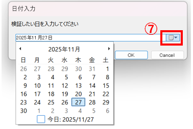 ⑦ 入力画面は枠内に手入力もできますが、右側のカレンダーボタンを押すと、カレンダー選択でも入力できる画面です。