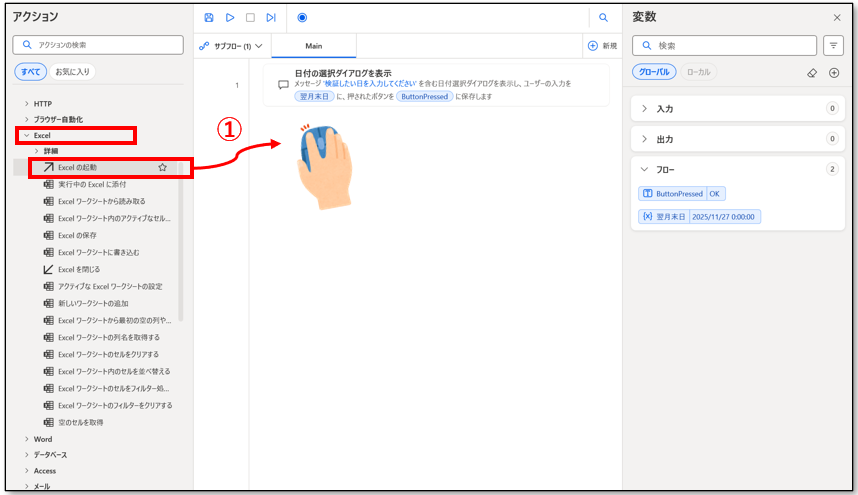 ① アクションのExcelを開き、「Excelの起動」をドラッグ&ドロップします。