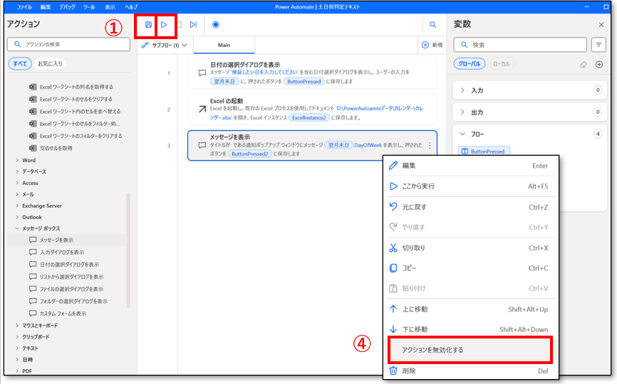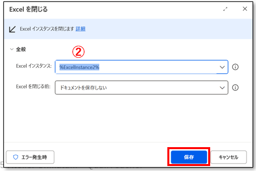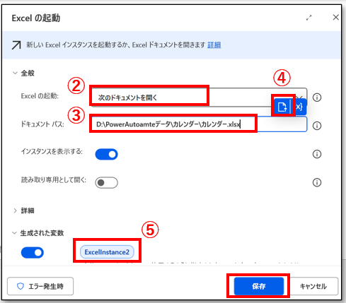 ⑤ 生成された変数に ExcelInstance が設定されましたが、今回は前回(基礎⑤)の連動も想定することで