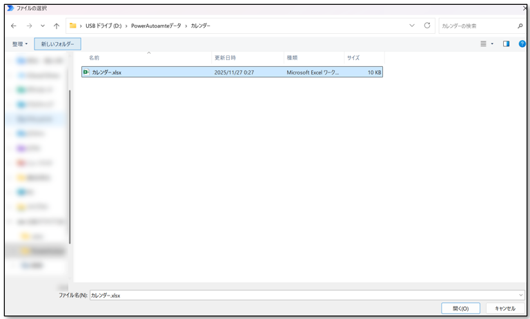 先ほど作成したカレンダーファイルを立ち上げておきます。(カレンダー立ち上げのタイミングは判定条件前であればどこでもよいのですが、一例として、この段階でフローに入れておきます)