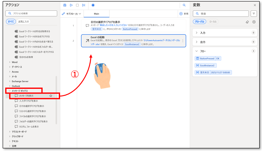 ① アクションのメッセージボックスを開き、「メッセージの表示」をドラッグ&ドロップします。