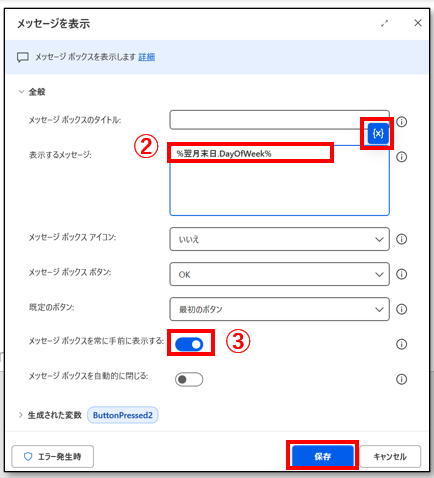 ② 表示するメッセージには、枠内をクリックして変数の総称{X}より %翌月末日.DayOfWeek% をプロパティより選択します。