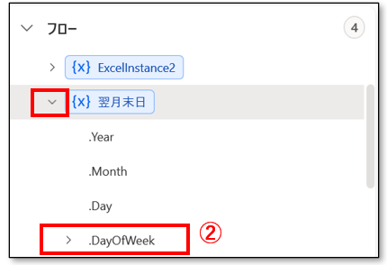 プロパティは、変数 翌月末日の左側の「>」をクリックすると開きます。 開くと「▽」になり、変数 DayOfWeek が現れます