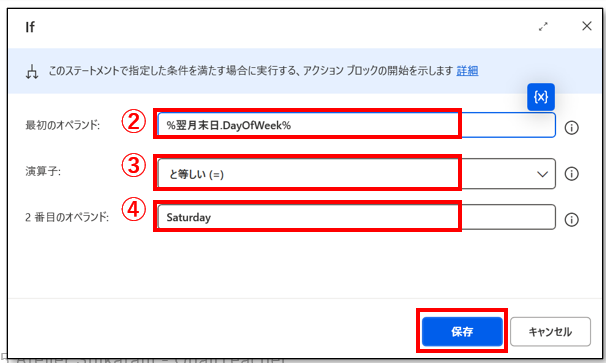 今回は翌月末日の曜日が何曜日か比較したいことから、最初のオペランドには変数