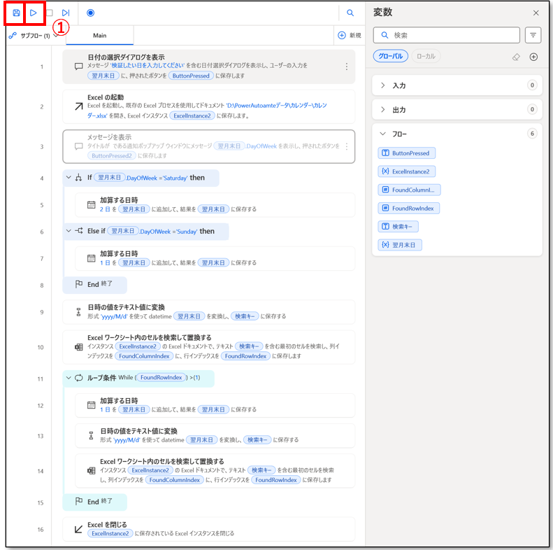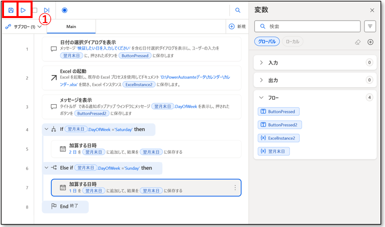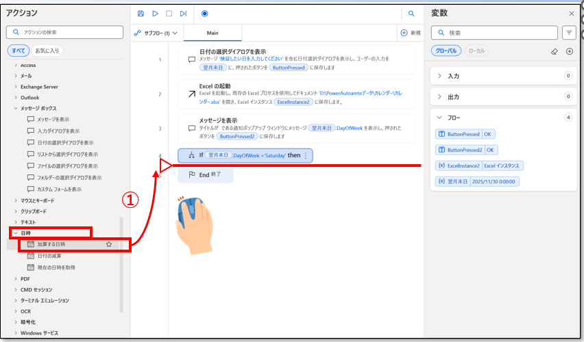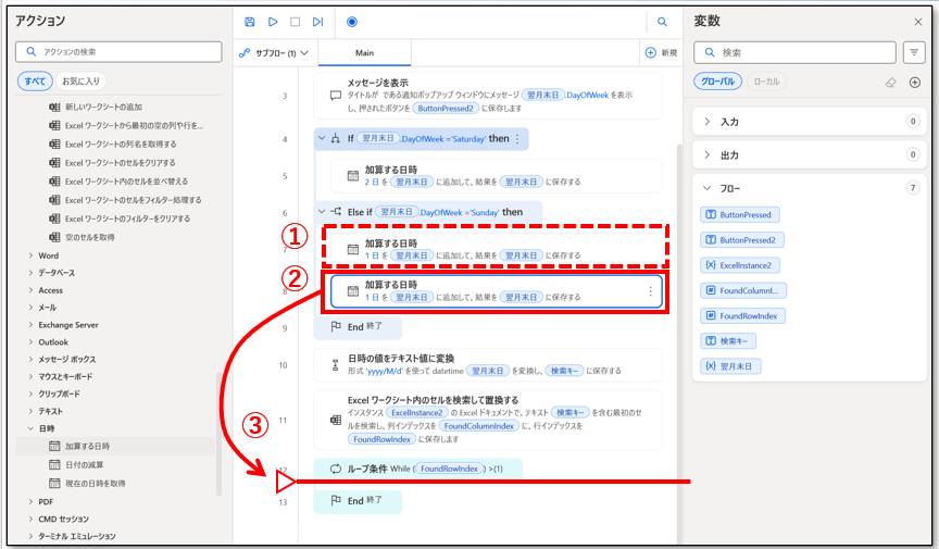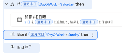 今回は、翌月末日の曜日をPADがチェックして、土曜日つまり「Saturday」であれば、この加算処理(2日分を足し算する)を行うといったものです。