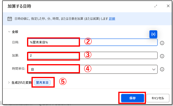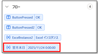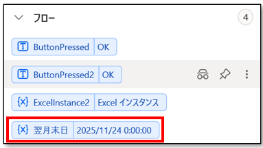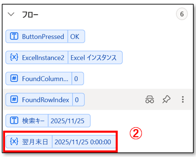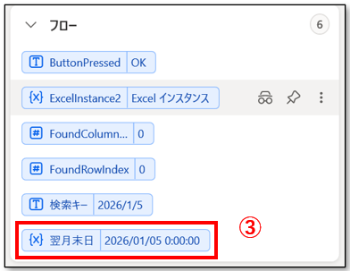 ⑥ 生成された変数は、デフォルトでは SelectedDate となっていますが、ここでは、先々翌月末日となった際の処理を想定して使用するため、名前を 「翌月末日」 として変更します。