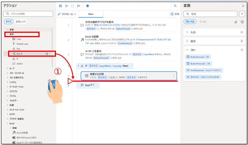 ① アクションの条件を開き、「Else if」を「加算する日時」と「End」の間にドラッグ&ドロップします。さらに別の分岐をつくることを意味します。