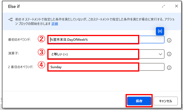 ② 最初のオペランドは…こちらも同様に、今回は翌月末日の曜日が何曜日か比較したいことから、最初のオペランドには変数