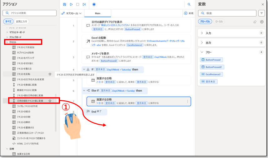 ① アクションのテキストを開き、「日時の値をテキスト値に変換」をドラッグ&ドロップします