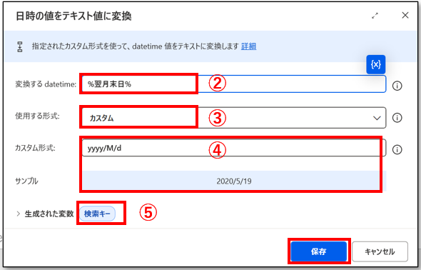 ② 変換するDatetimeは、枠内をクリックして、変数{X}より %翌月末日% を選択します。