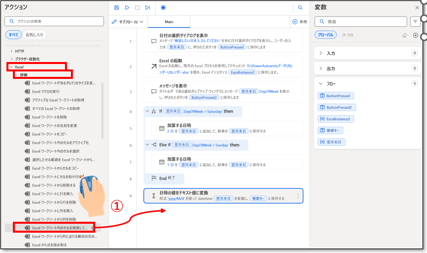 ① アクションのExcelを開き、「Excelワークシート内のセルを検索して置換する」をドラッグ&ドロップします