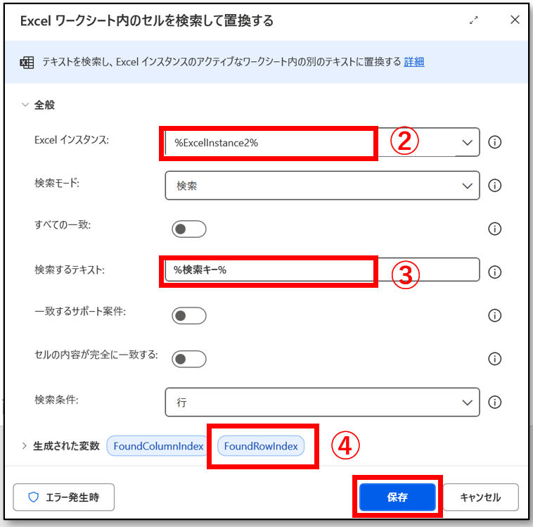 ④ 今回、検索でヒットした「列」と「行」を変数で保管しますが、使うのは検索した「行」のロケーションを扱う変数 %FoundRowIndex% のみとなります。