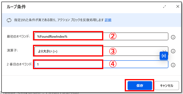 ③ これが、「1」より大きいと、%FoundRowIndex% は検索行を格納するので、何かしら検索で引っかかったことになります。(検索してヒットした行数には無関係で、ヒットするかしないかを見ています)
