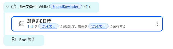 ③ 追加された「加算する日時(翌月末日を1日分)」のブロックを「ループ条件」と「End」の間にドラッグ&ドロップして移動します。