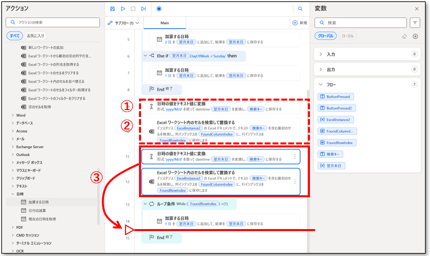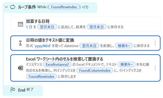 ③ 追加された2つの「日時のテキスト値に変換」ブロックと「Excelワークシート内のセルを検索して置換する」ブロックをまとめて「加算する日時」と「End」の間にドラッグ&ドロップして移動します。