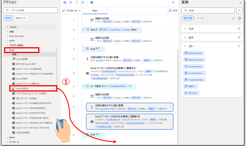 ① アクションのExcelを開き、「Excelを閉じる」をドラッグ&ドロップします