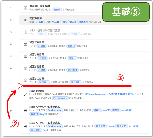 ③ これをドラッグ&ドロップで「加算する日時」と「Excelの起動」の間にまとめて移動していきます。