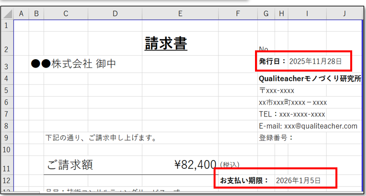 ④ これで一連の請求書にて、お支払期限の部分に「翌月末日」を営業日ベースでプロットできるようになりました。