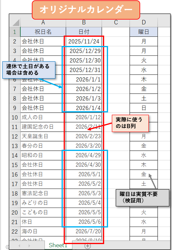 (一般的なGW、夏季連休、年末年始などを考慮して2025年末から2026年度分のサンプルを作っています)