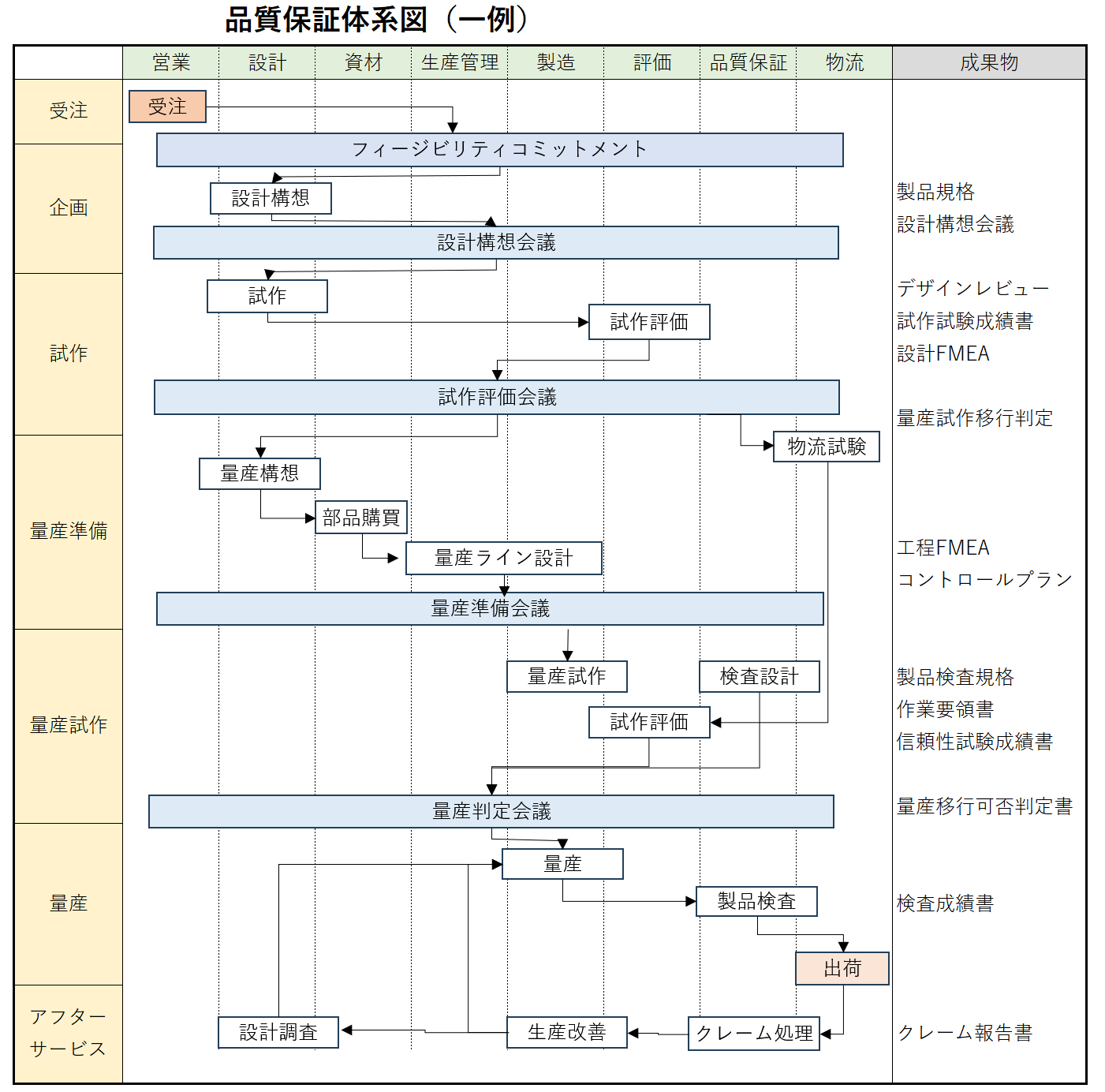 縦軸に受注~企画~試作を含む開発設計~評価~製造~検査~出荷~アフターサービス、そしてクレーム処理などを含む形の一連のモノづくりの流れを示します。