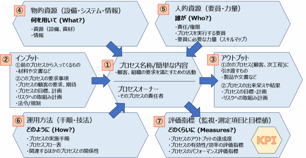 真ん中に「プロセス」の名称があります。どのようなプロセスなのかがわかるように簡潔に記しておきましょう。また、その「プロセス」の責任者を明確にしておくことが重要です。